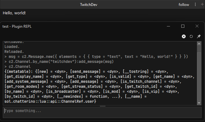 Plugins can now create styled messages through c2.Message.new(). Previously, only system (gray) messages could be created. Compared to C++, there are a few capabilities missing—namely emotes and images. These will be added in future releases along with an API to inspect and alter existing messages (e.g. in filters).